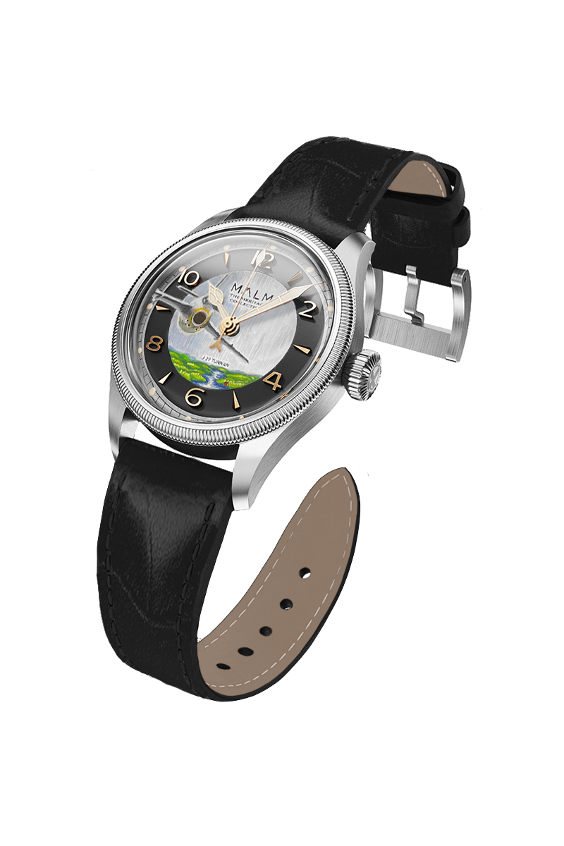 Inspired by the iconic J29 Tunnan, this pilot watch pays tribute to Swedish aviation history and celebrates the 100th anniversary of the Swedish Air Force. Each watch features a hand-painted dial, designed and painted by Mythic Scandinavian Watch Art, depicting the legendary J29 Tunnan aircraft—Each dial is painted to order, making every piece unique.